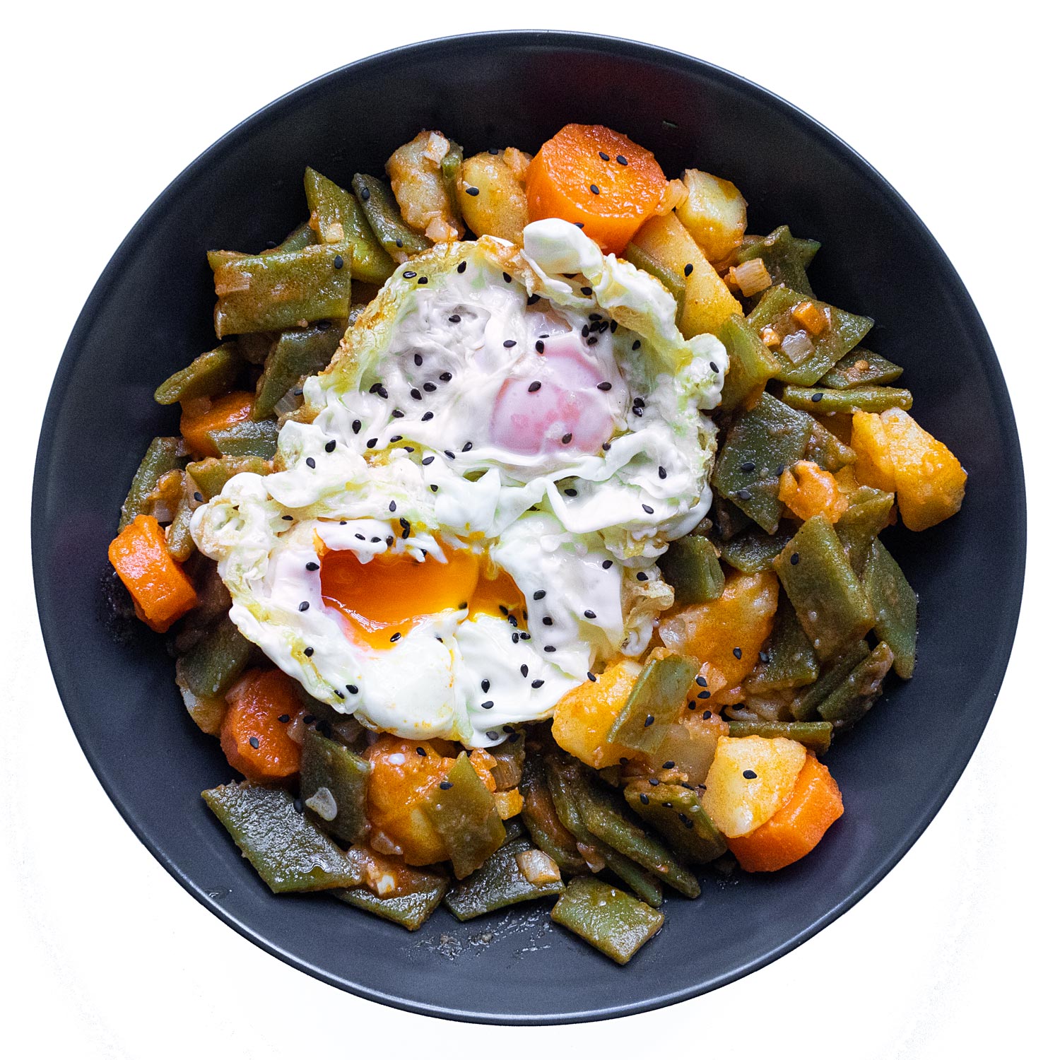 Pon el huevo o la panceta sobre las judías y decora con las semillas.