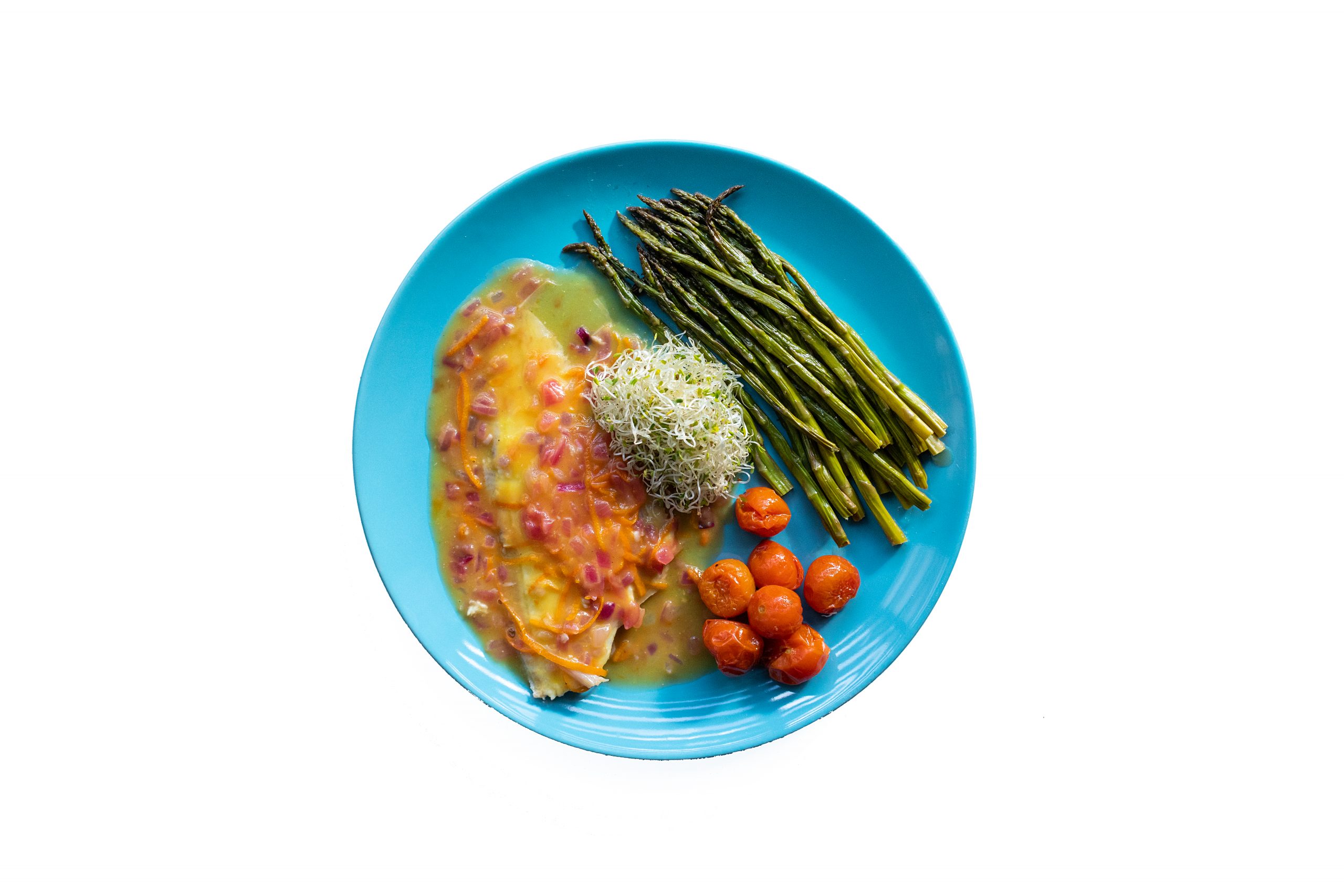 Sirve el pescado con los espárragos + los tomates y acompaña con los brotes.