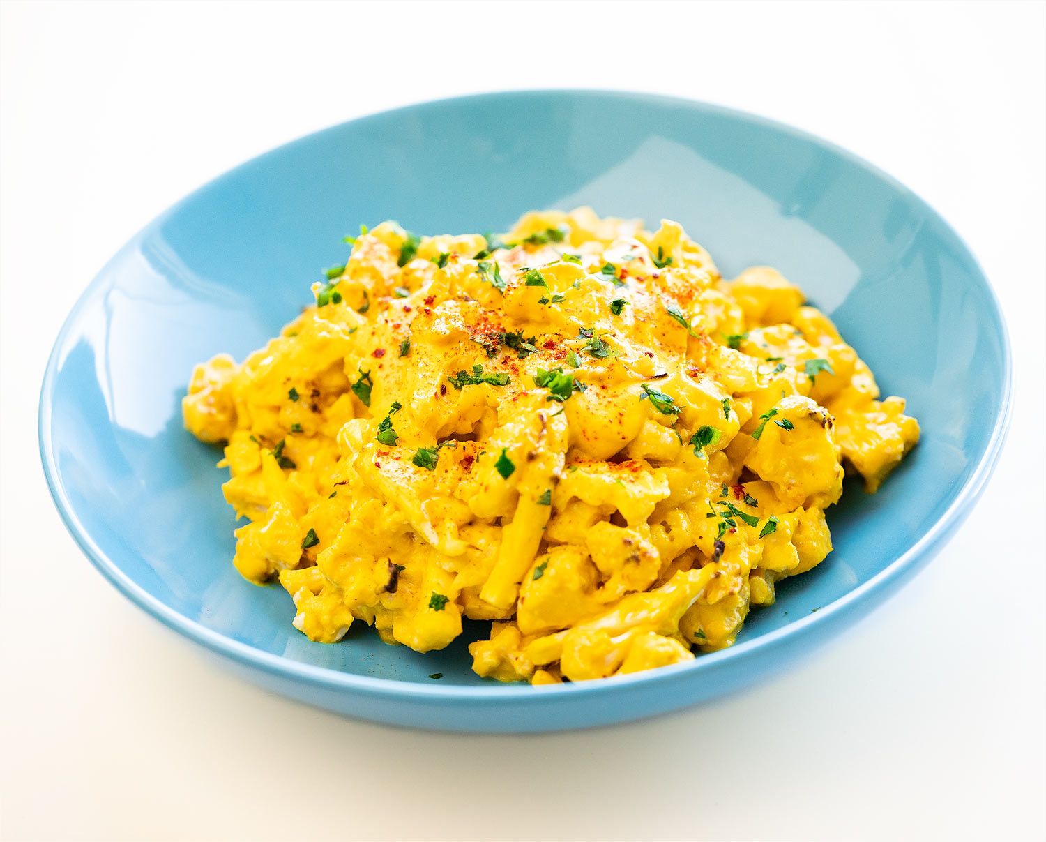 Mientras horneas la calabaza, corta la coliflor en trozos pequeños, parecidos al tamaño de los macarrones.