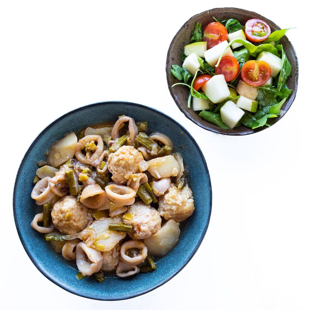 Haz bolitas del tamaño de una nuez y añade a la cazuela del guiso de chipirones. Si te ha quedado poco líquido, añade caldo hasta cubrir ⅔ de las bolitas de pollo. Pon a fuego medio y cierra con la tapa. Cocina durante 10 minutos. Prueba el punto de sal.
