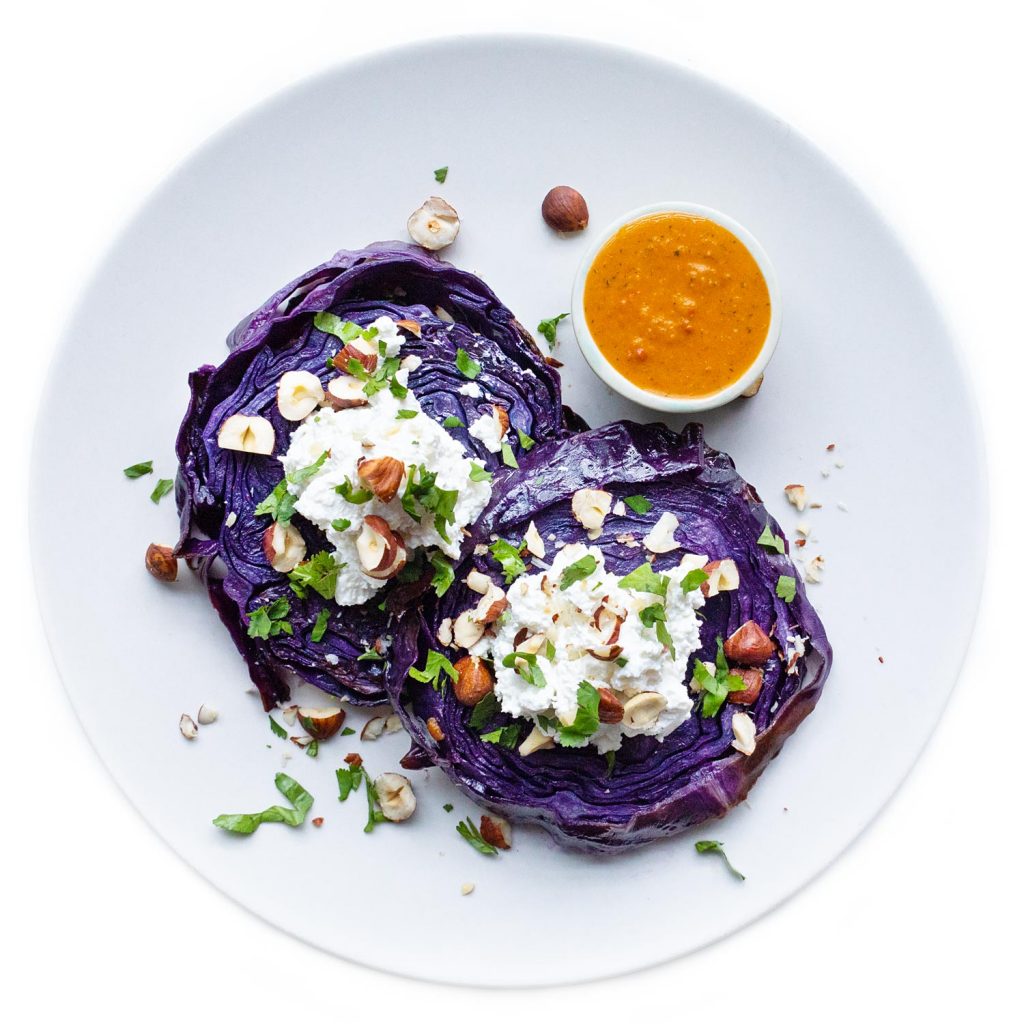 Coloca el queso sobre la lombarda y decora con las avellanas + el cilantro. Acompaña con el chimichurri.