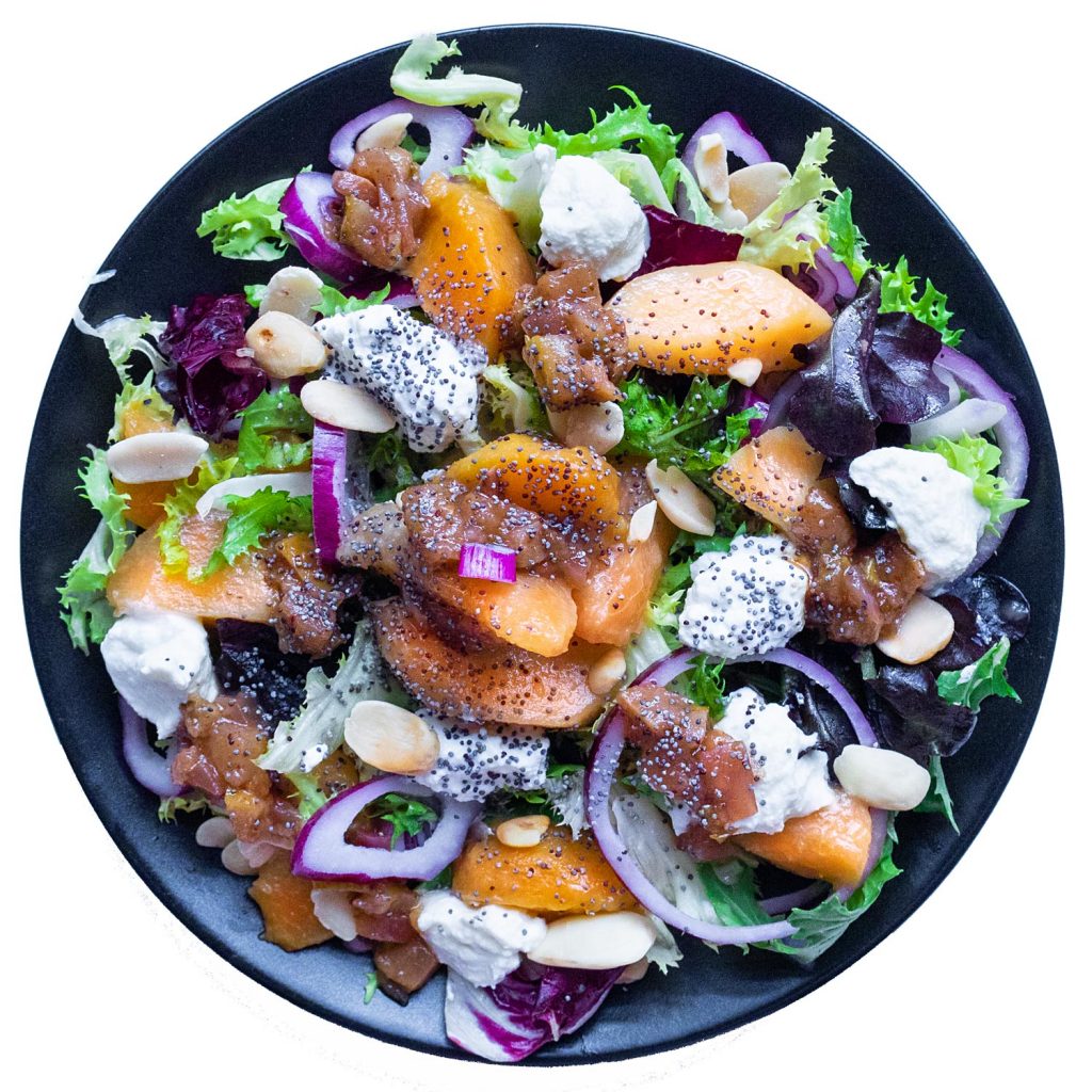 Sirve los melocotones + el queso sobre la ensalada y salsea con el chutney.
