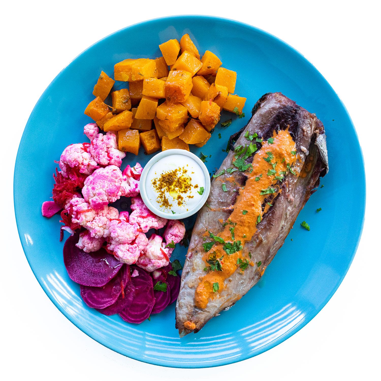 Sirve la melva con el chimichurri. Acompaña con los pickles y salsea la calabaza con el yogur.