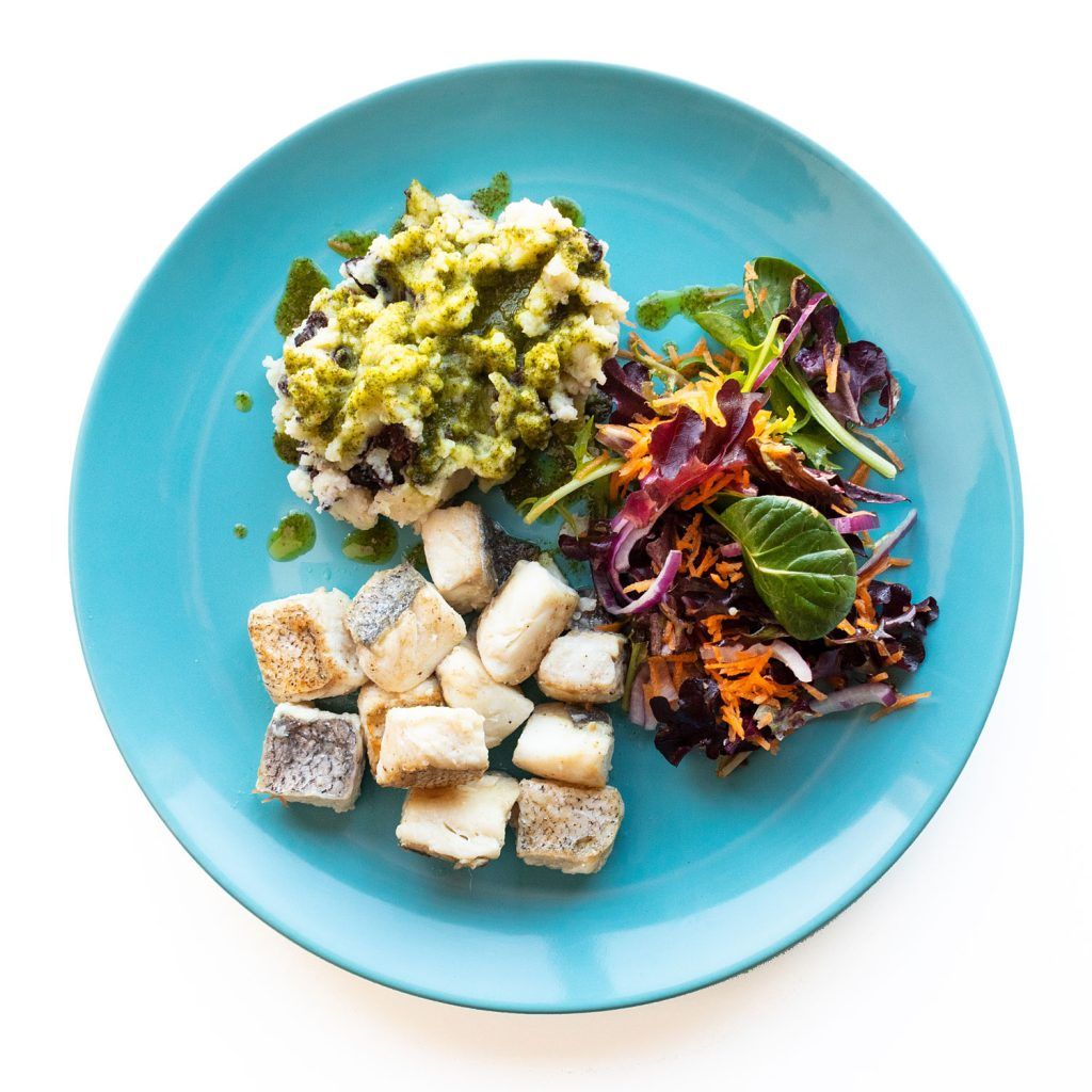 Dados de Merluza con Patata, Aceituna Negra y Mojo de Cilantro