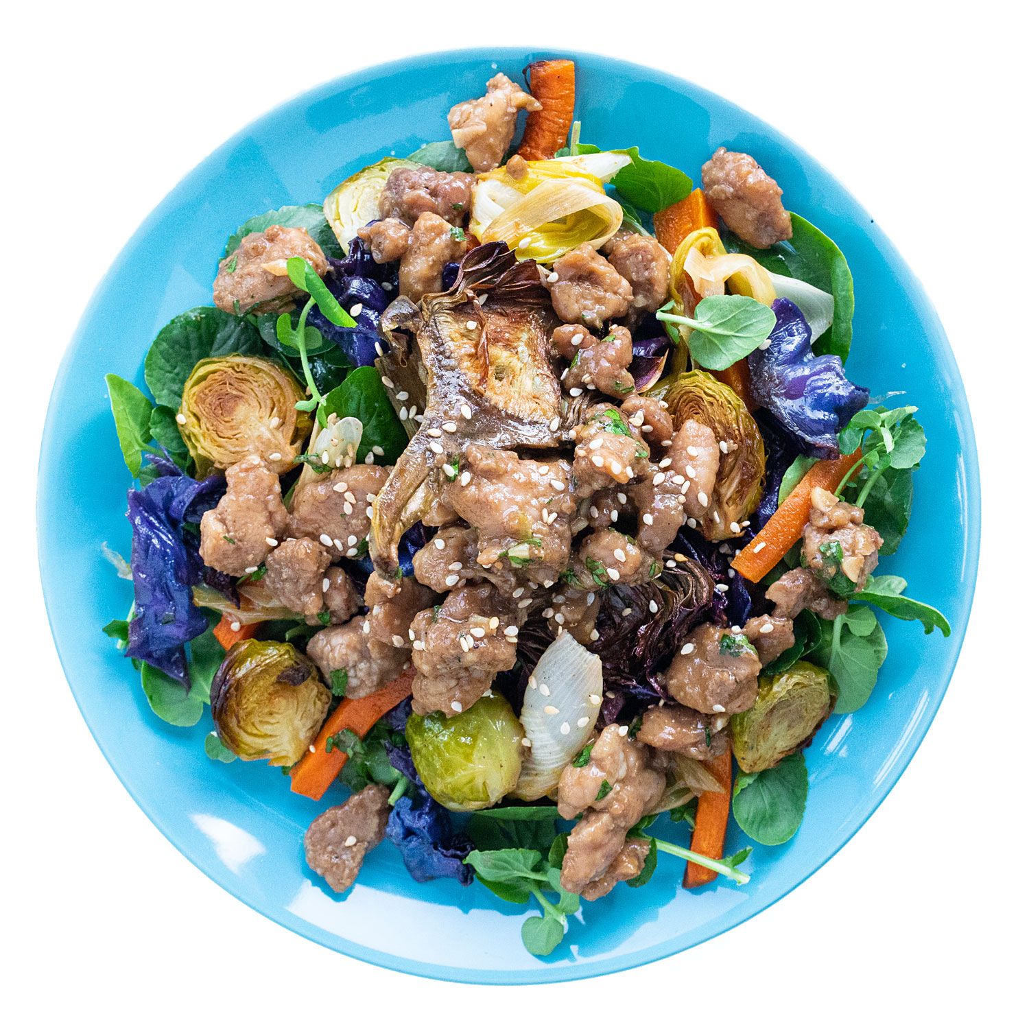 Mezcla todos los ingredientes + ¼ tsp sal en una bandeja de horno y remueve hasta integrar.