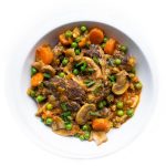 Añade a la slow cooker 1 Tbsp aceite de oliva + todos los ingredientes en este orden: la carne + las verduras + las especias + ½ tsp sal + el vino y cubre con agua hasta ⅔ de la altura de los ingredientes.