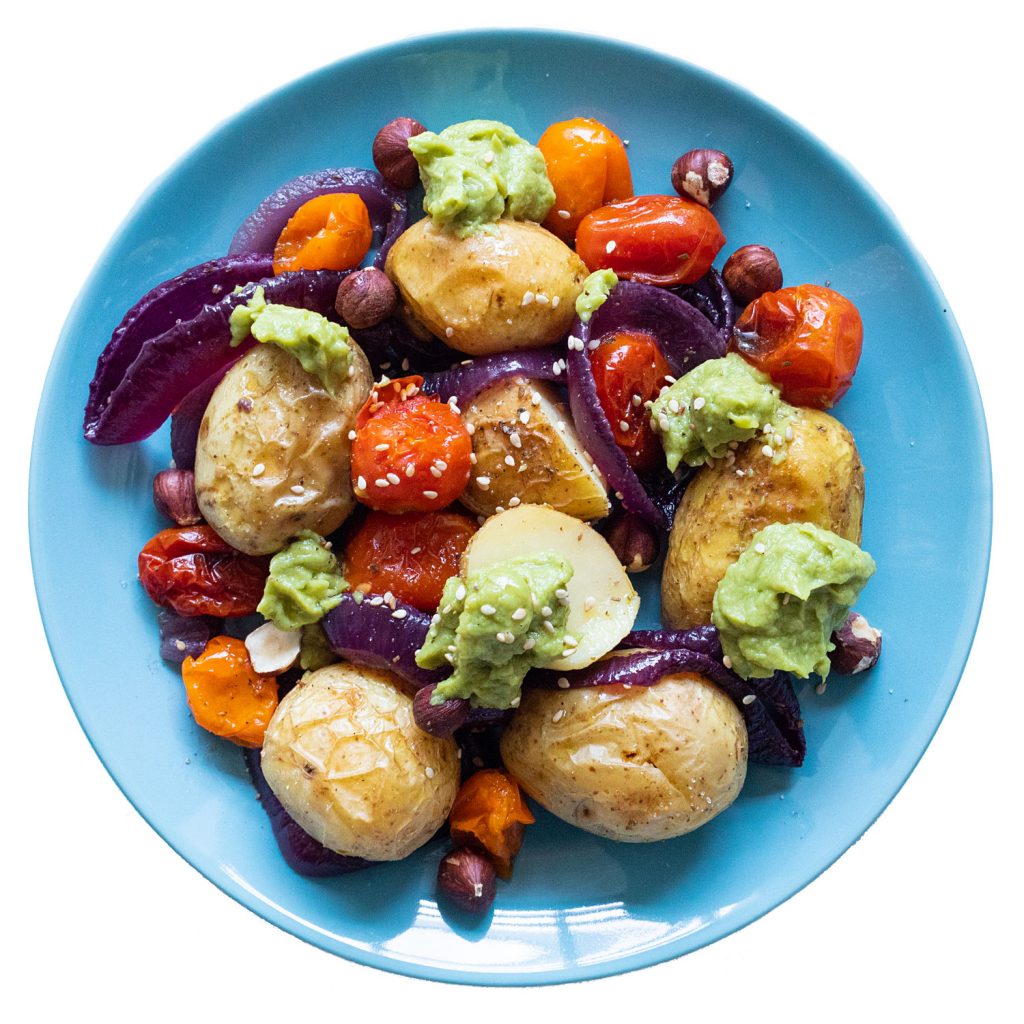 Hornea a media altura durante 30 minutos o hasta que las verduras estén blandas y se doren un poco. Comprueba la cocción de las patatas pinchando con un tenedor.