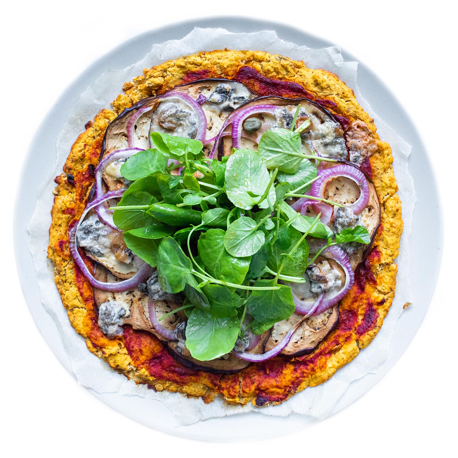 Retira la base del horno y añade los ingredientes del relleno desde la salsa de tomate hasta el queso (si haces AIP, añade la levadura cuando la saques del horno).