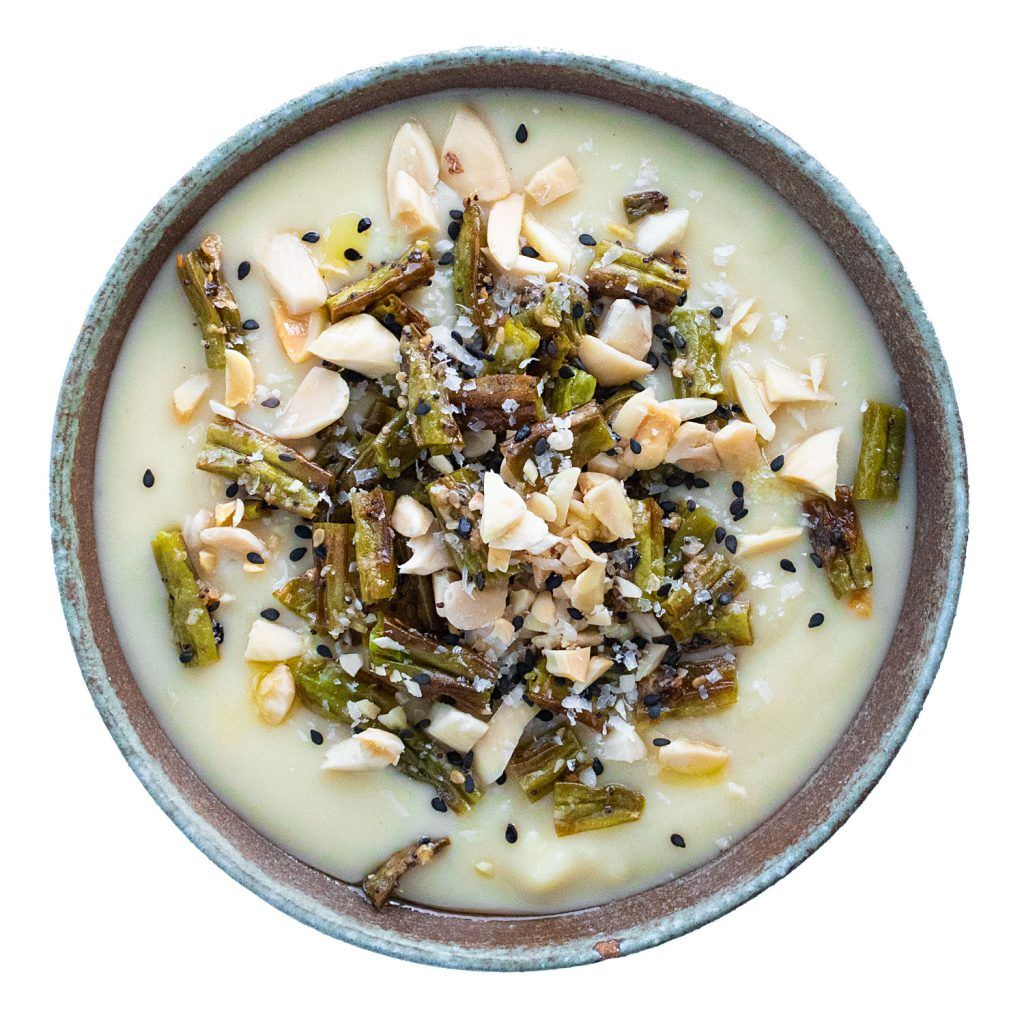 Sirve el puré y coloca encima los chips + el resto de semillas + las almendras.