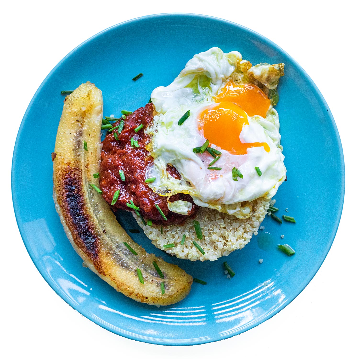 Pon la salsa de tomate + el huevo sobre la quinoa y acompaña con el plátano. Decora con el cebollino y sirve.