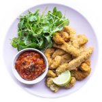 Sirve las rabas con la salsa + la lima y acompaña con la ensalada.