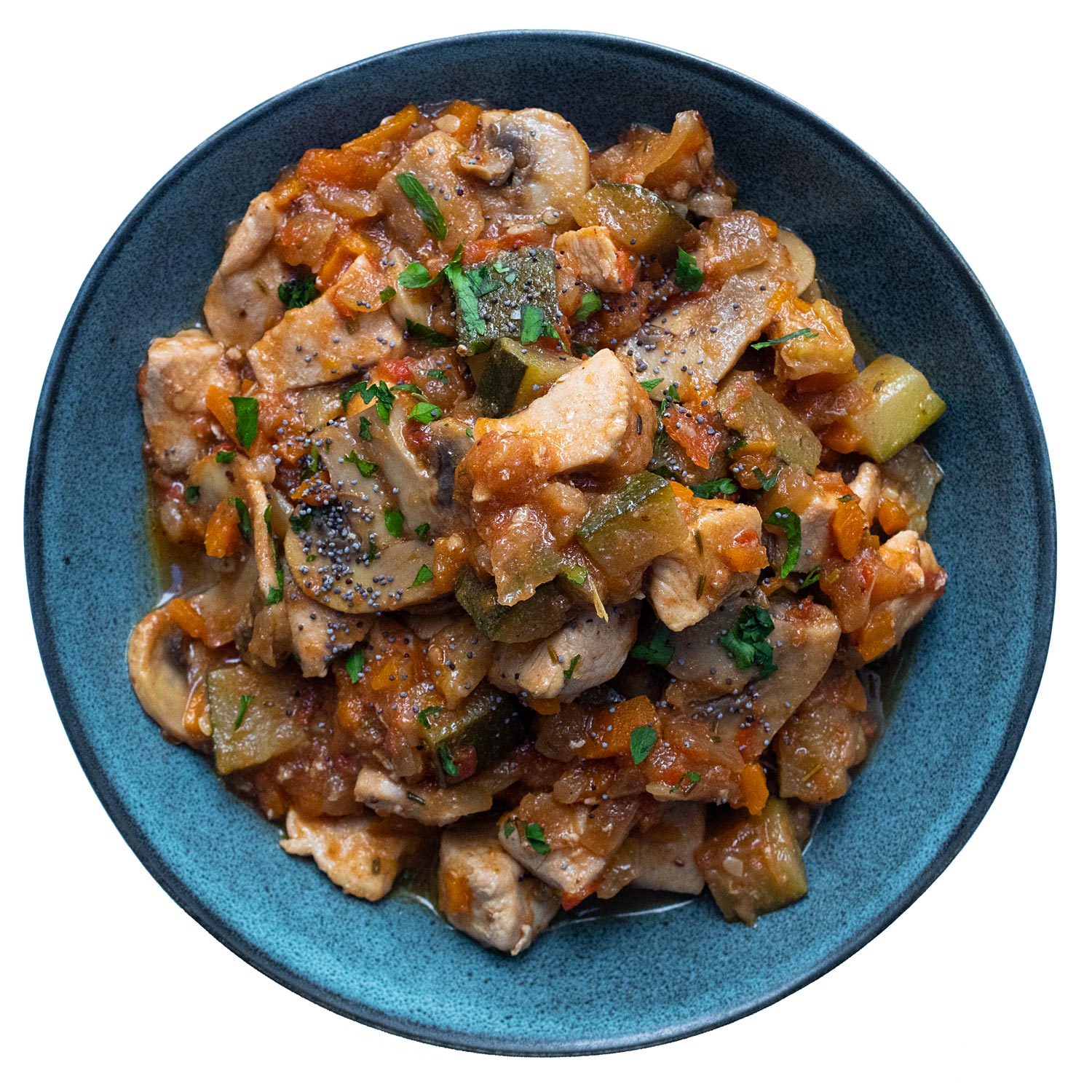 Añade a la slow cooker todos los ingredientes en este orden: 2 Tbsp aceite de oliva + las verduras + la carne + las especias + el vino + 1 cup caldo + ¼ tsp sal. Si quieres, puedes saltear previamente el pollo en una sartén a fuego alto con 2 Tbsp aceite de oliva.