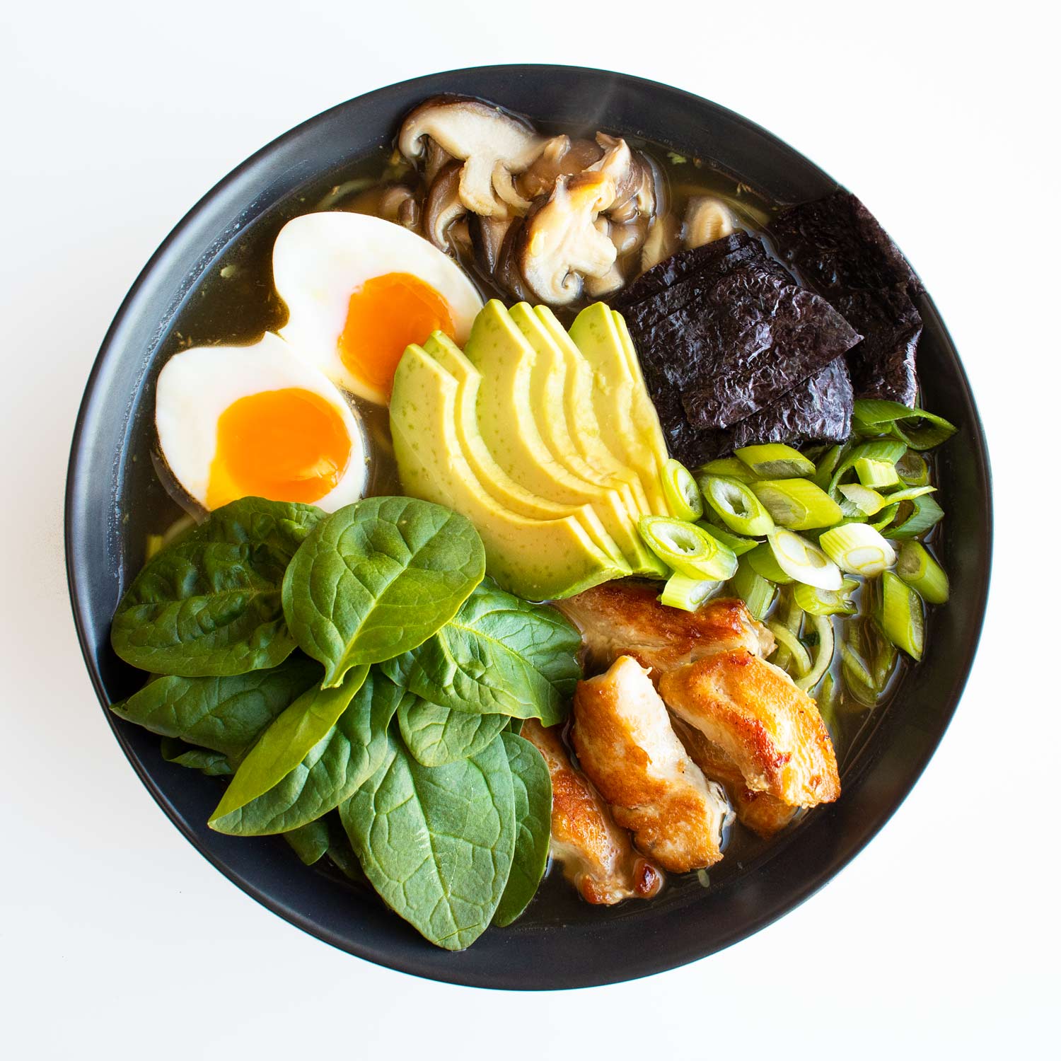 Reparte el caldo, los fideos y las setas en 4 boles y coloca encima el resto de ingredientes en pequeños montoncitos: el pollo, la espinaca, el alga y el huevo (sustituye por aguacate para AIP) y decora con los aros de cebolleta. Sirve y disfruta.