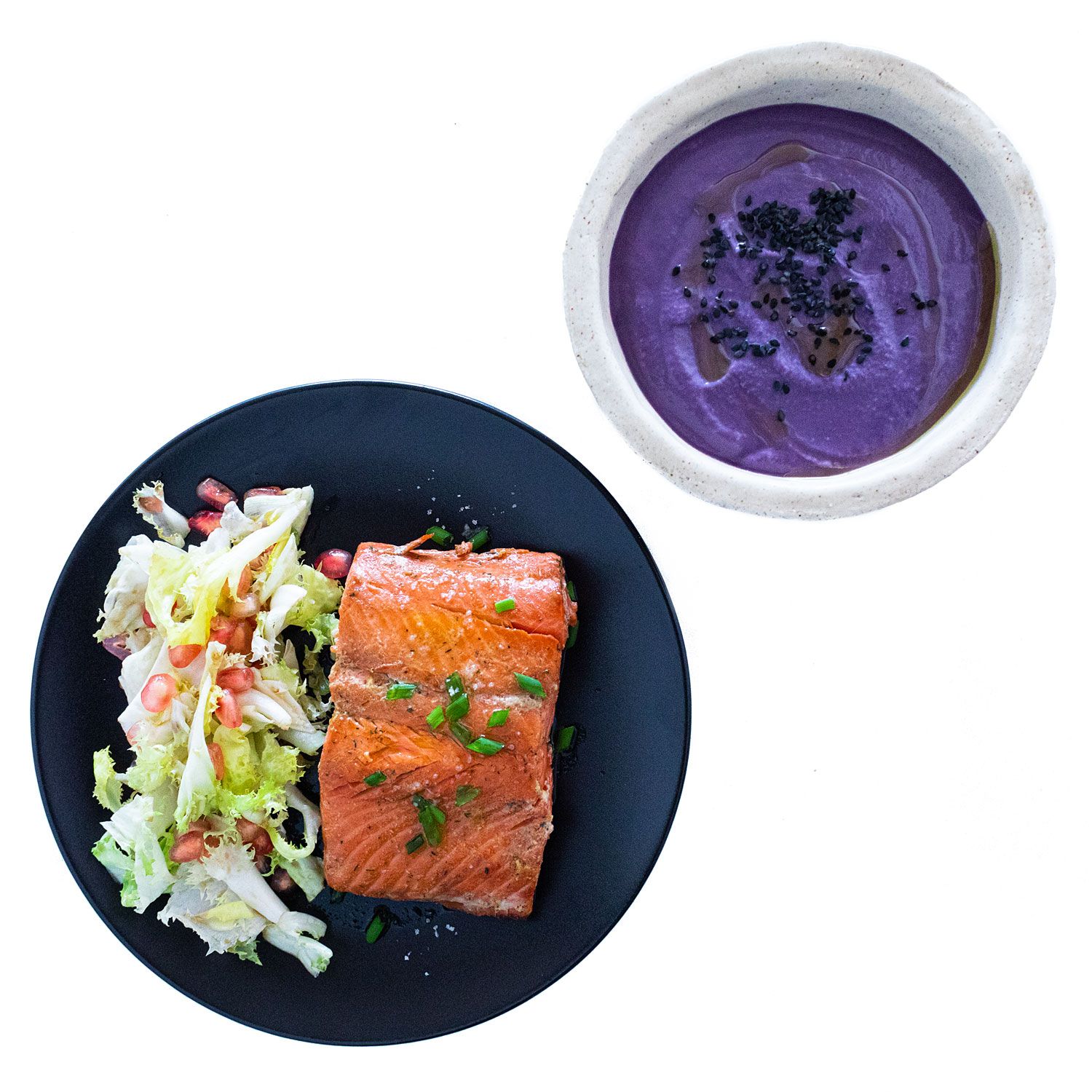 Sirve el salmón con la ensalada. Acompaña con la crema + las semillas.
