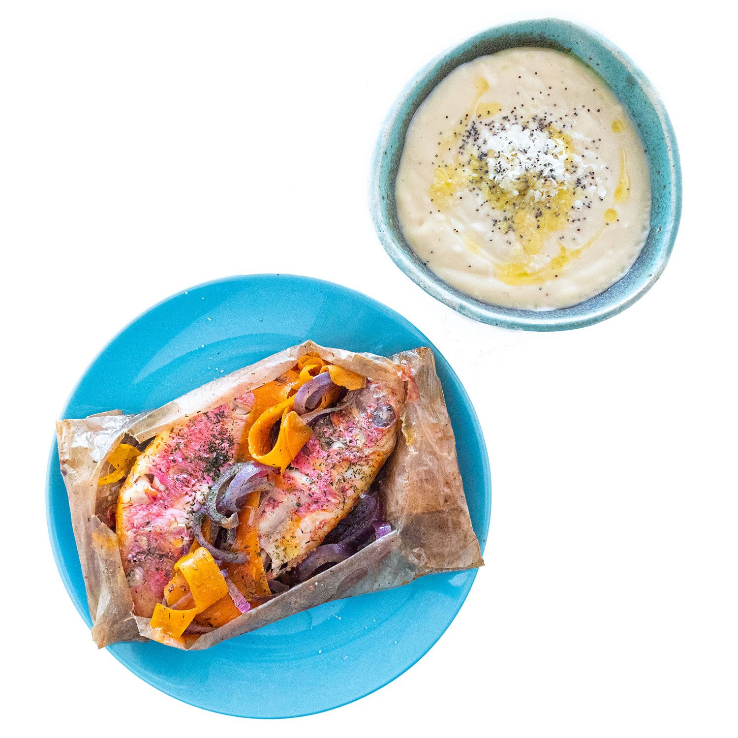 Sirve el papillote en el papel de horno y abre con unas tijeras justo antes de tomar (cuidado con el vapor que desprende porque quema). Acompaña con la crema + las semillas.