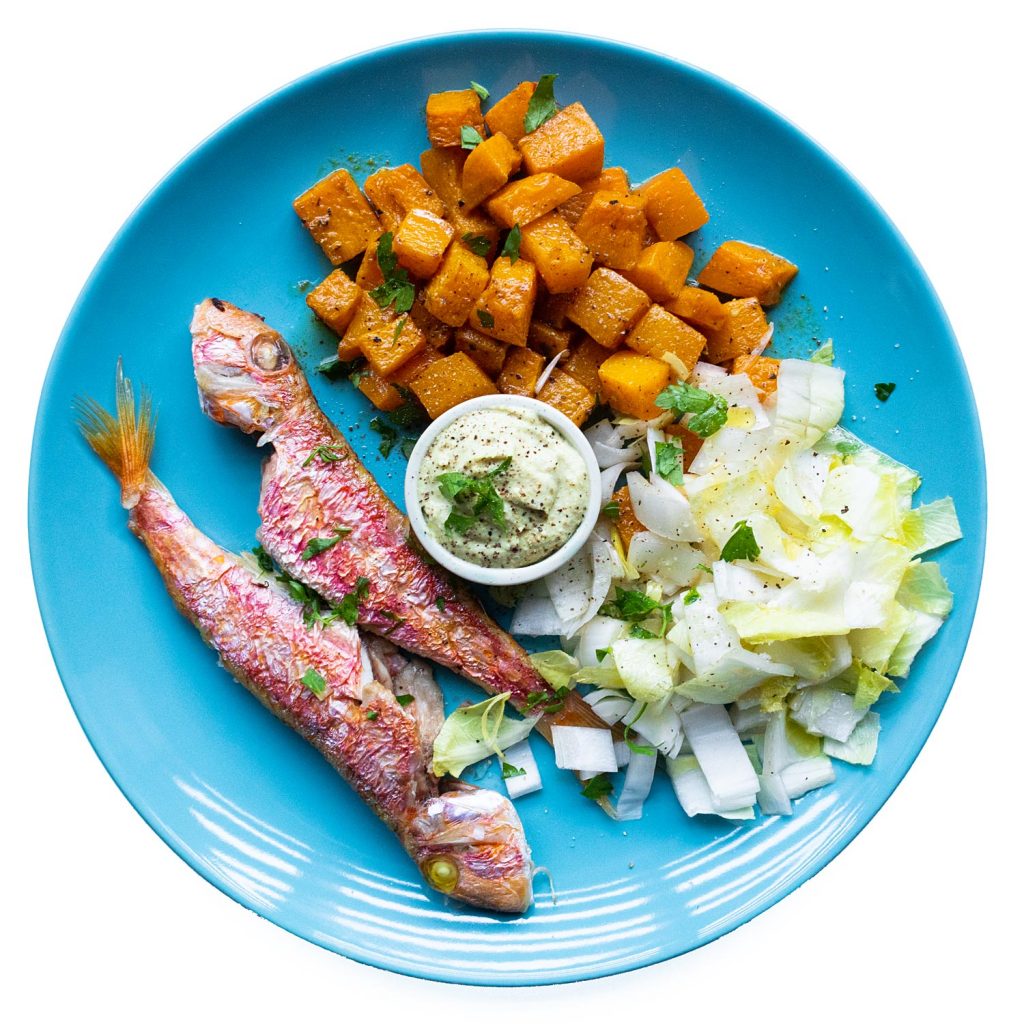 Sirve los salmonetes con la calabaza. Acompaña con las endivias + el dip. Decora con el perejil.
