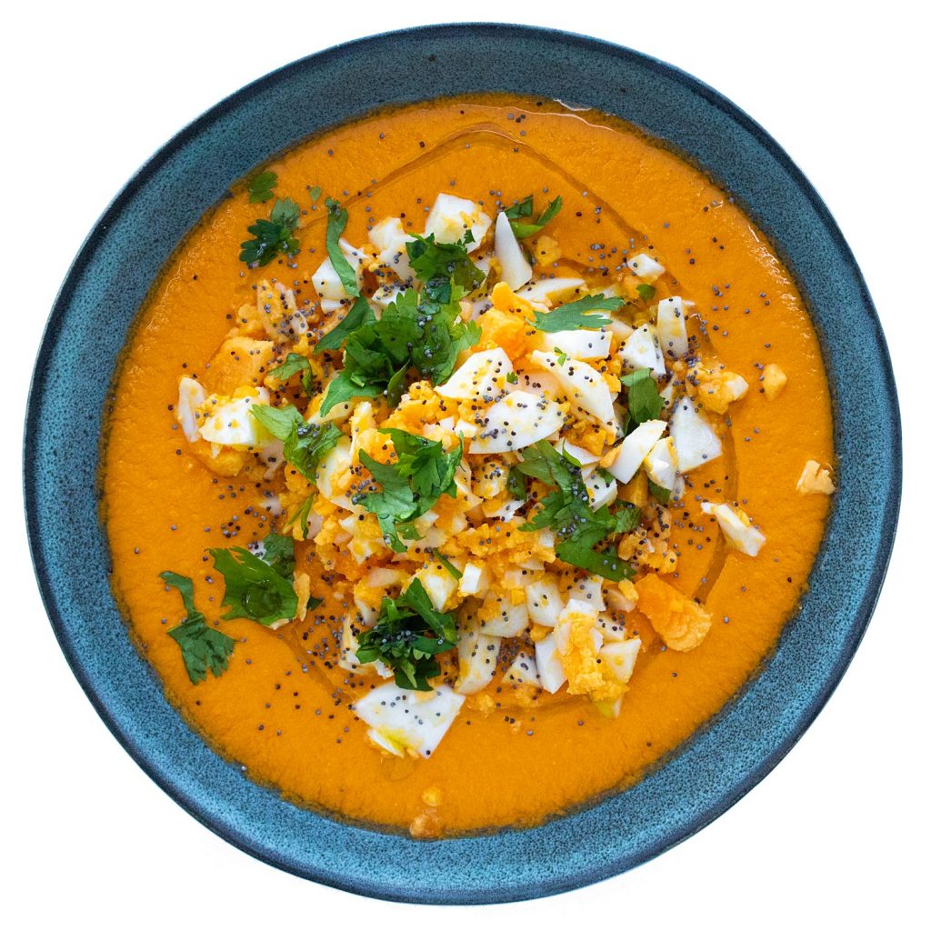 Sirve el salmorejo en boles y coloca encima el huevo (sustituye por cecina si haces AIP). Decora con las semillas + el cilantro.