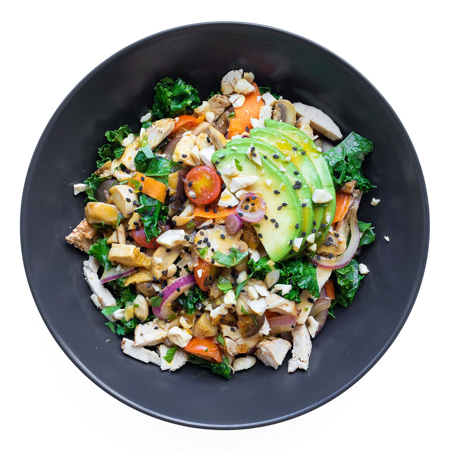 Sirve el salteado con el aguacate + la salsa de mandarina. Decora con los anacardos + las semillas + el perejil.