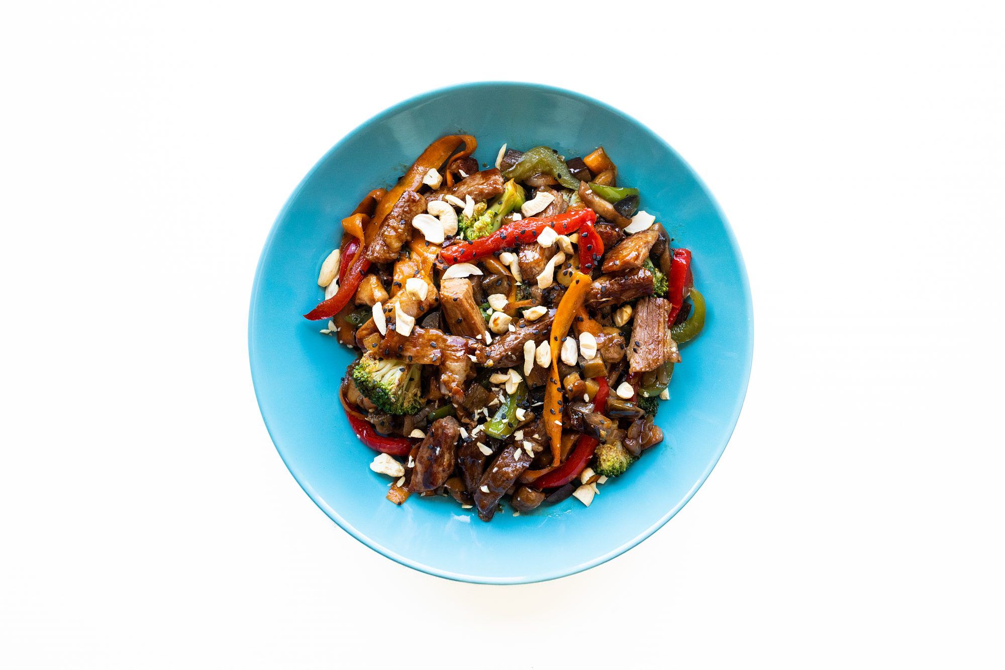 Añade el secreto + la salsa teriyaki (primero la mitad y prueba, si lo quieres más intenso sigue añadiendo salsa) + los anacardos, remueve y cocina durante 1-2 minutos.