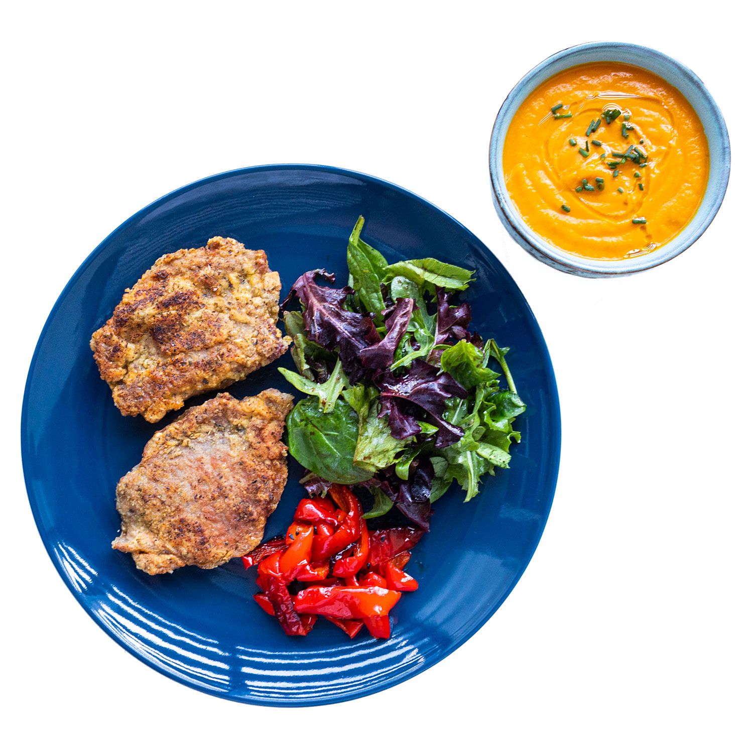 Tritura la calabaza + 1 ½ Tbsp aceite de oliva + el pimentón + la leche de coco + ¼ cup de agua con la batidora de mano, de vaso o el procesador durante 2-3 minutos o hasta que te quede una crema lisa. Prueba el punto de sal.