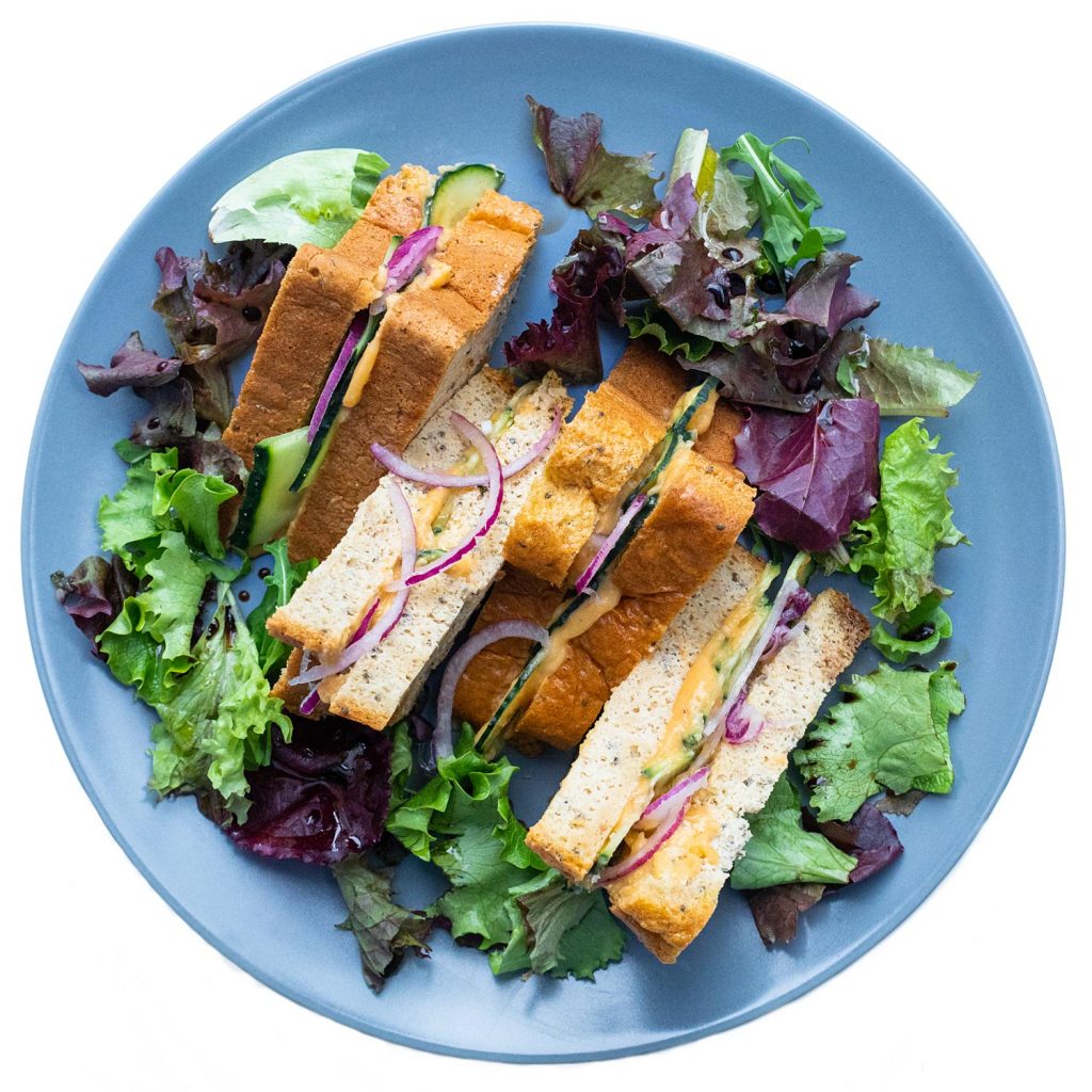 Monta los sándwiches untando primero las rebanadas con el hummus. Rellena con la cebolla + el pepino + los brotes.