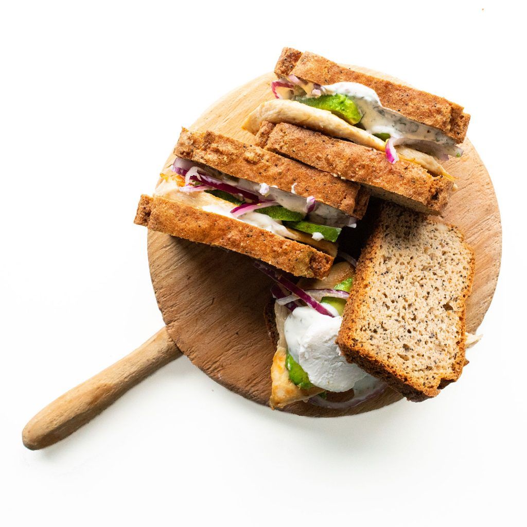 Sandwich de Pollo con Aguacate, Cebolla Roja y Queso de Cabra