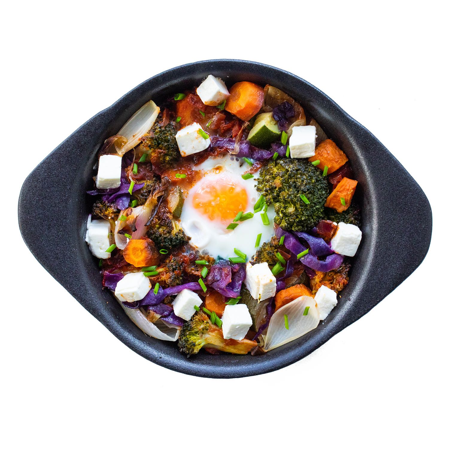Pon una sartén grande a fuego medio y añade las verduras asadas + la salsa de tomate (tienes la receta disponible en el apartado de Salsas Básicas de la sección de Recursos del Club). Calienta durante 3 minutos.