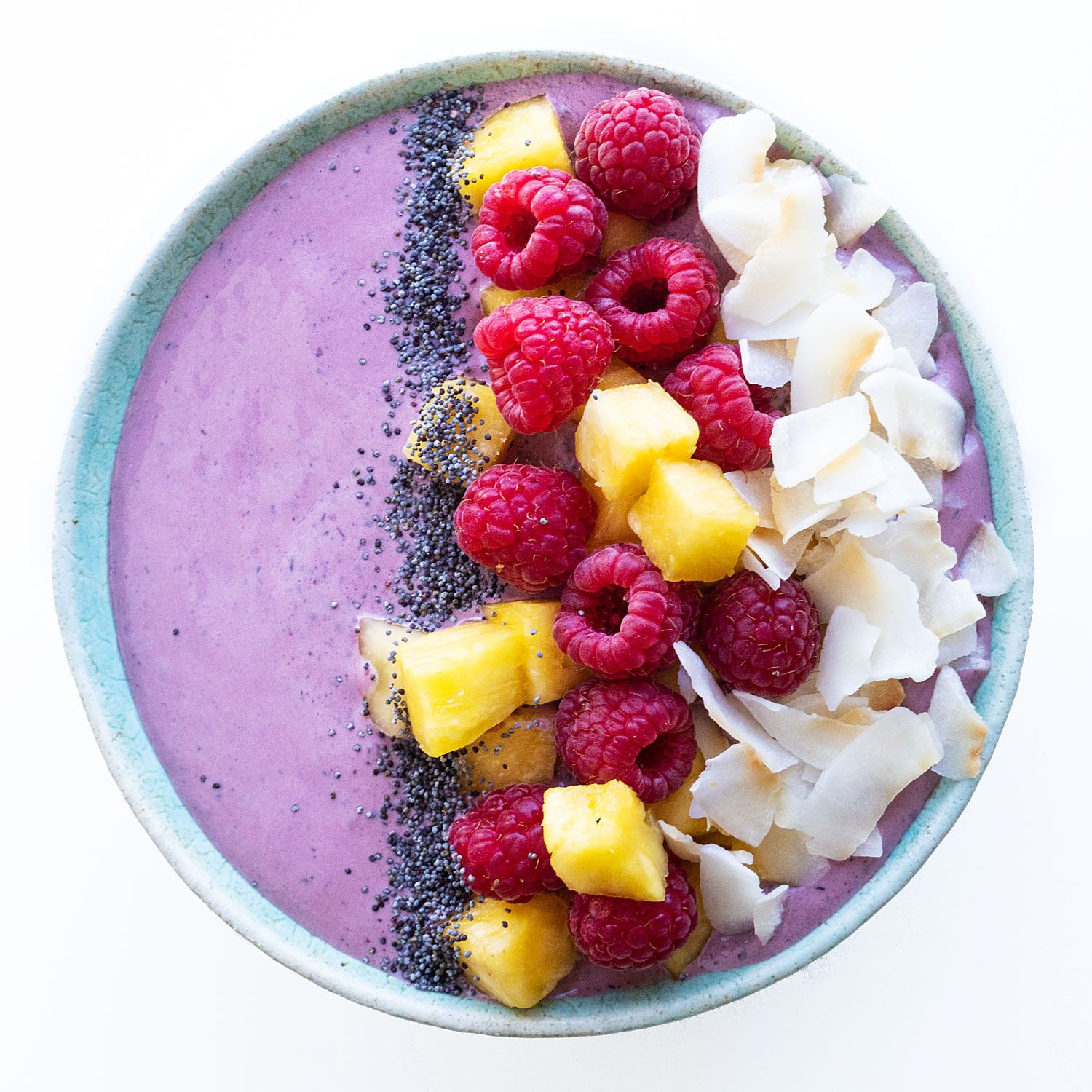 Reparte las frambuesas + la piña + los chips + las semillas en los boles. Sirve frío.
