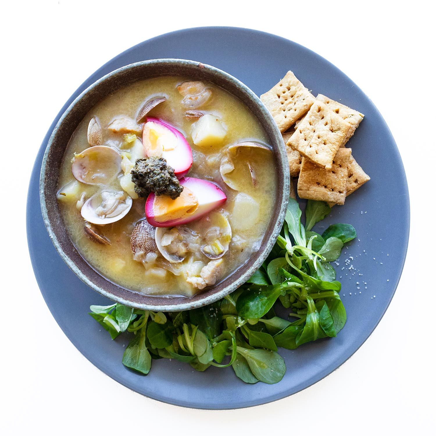 Aliña los canónigos con 3 Tbsp aceite de oliva + el vinagre + la pimienta + ¼ tsp sal y sirve junto a la sopa. Acompaña con los crackers.