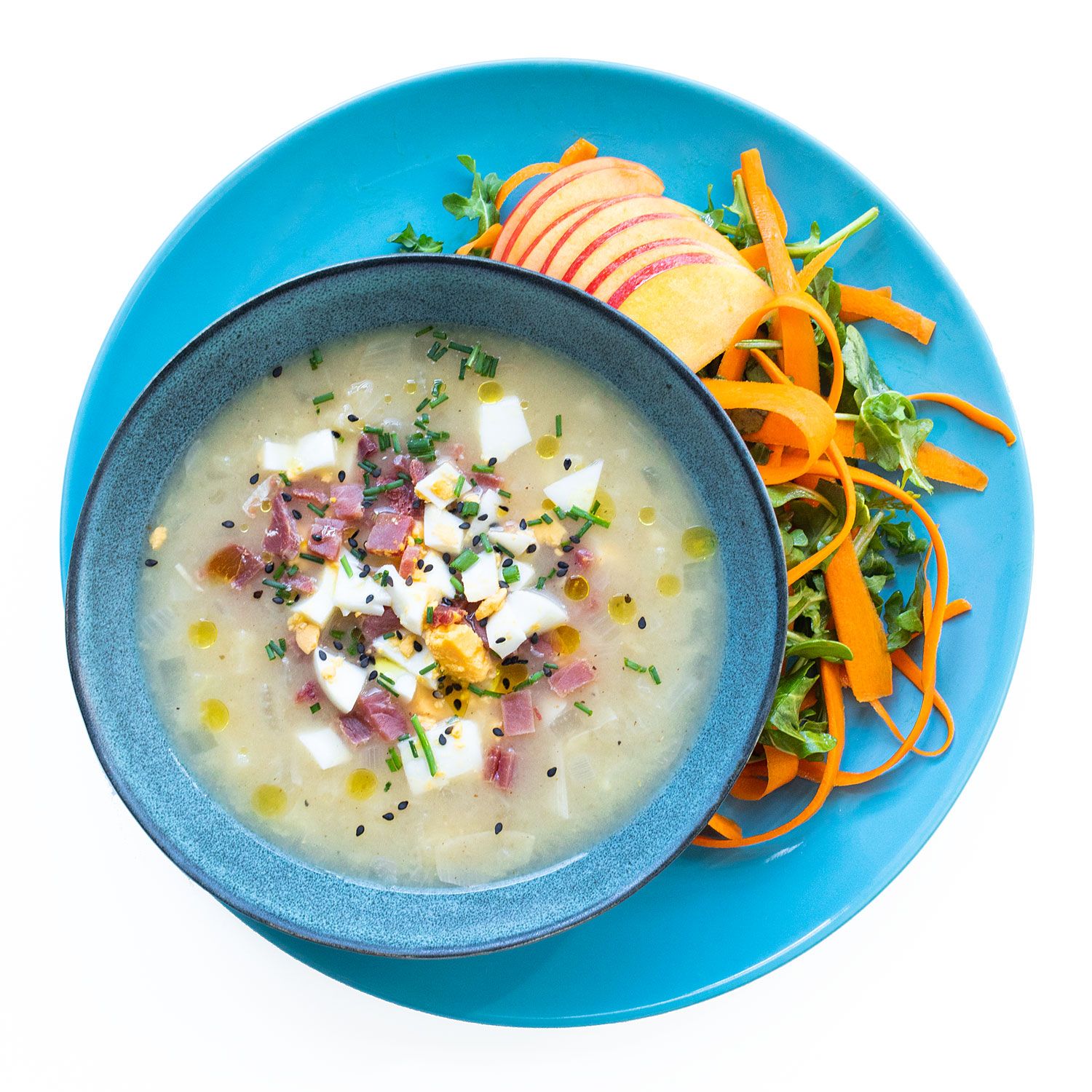 Sirve la sopa en boles y reparte por encima el huevo + el jamón + las semillas +el cebollino. Acompaña con la ensalada.