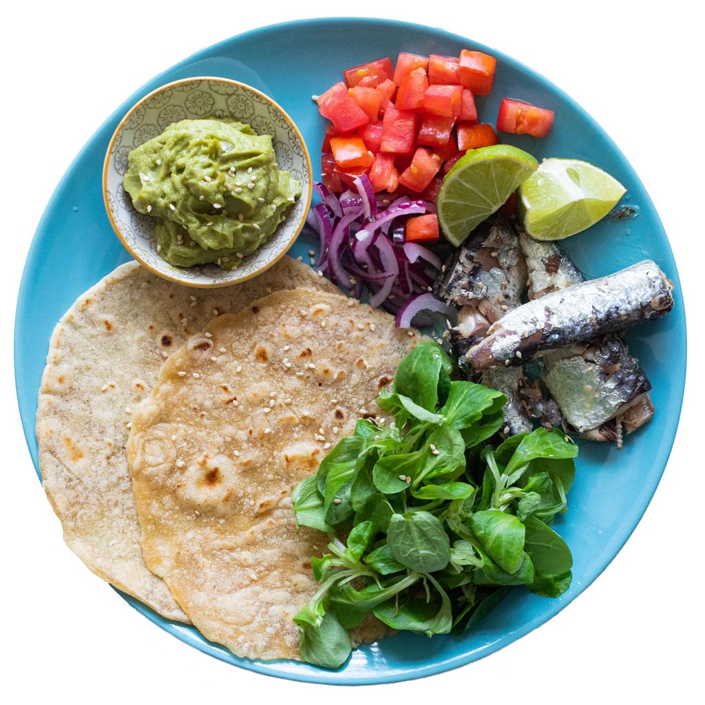 Monta los tacos con las sardinas + la cebolla + el tomate + el alioli + el cebollino y rocía con el zumo de lima. Acompaña con la ensalada.