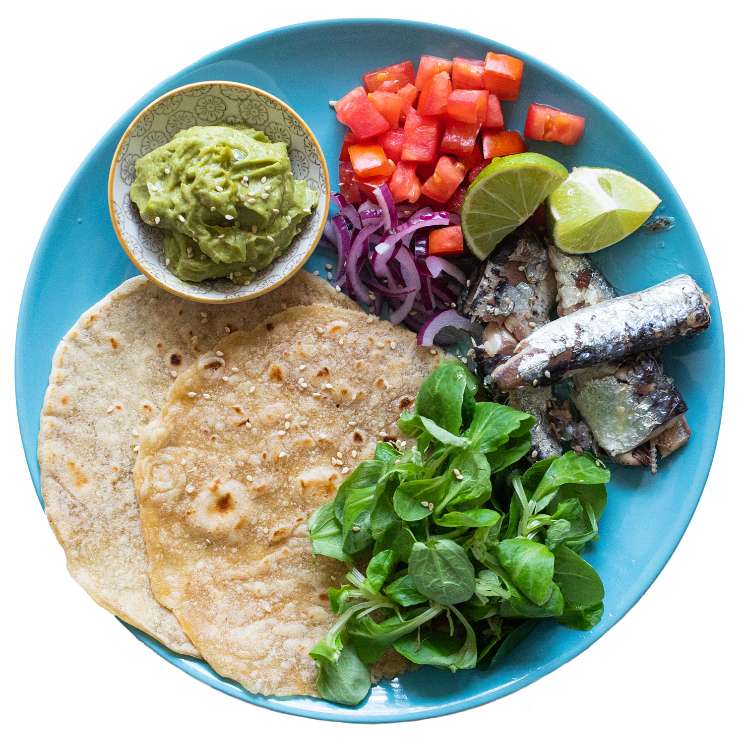 Monta los tacos con las sardinas + la cebolla + el tomate + el alioli + el cebollino y rocía con el zumo de lima. Acompaña con la ensalada.