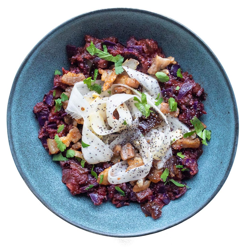 Añade todas las verduras desde el ajo hasta la lombarda y rehoga durante 10-12 minutos o hasta que estén blandas.