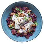 Sirve la panceta + los espárragos sobre el chili y decora con las semillas.
