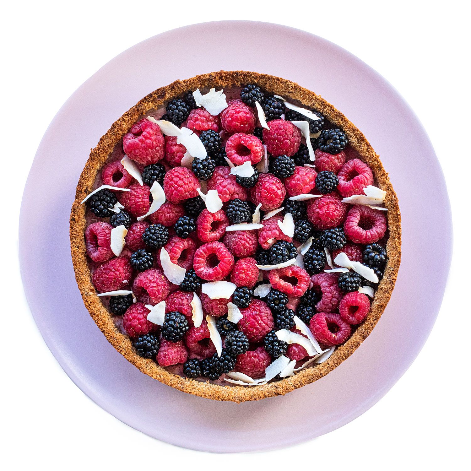 Cubre la tarta con los frutos rojos y decora con los chips.