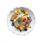 Coloca sobre el tartar las endivias + los brotes + las gambas asadas + la tostas. Decora con el sésamo + el cebollino + la albahaca y sirve.