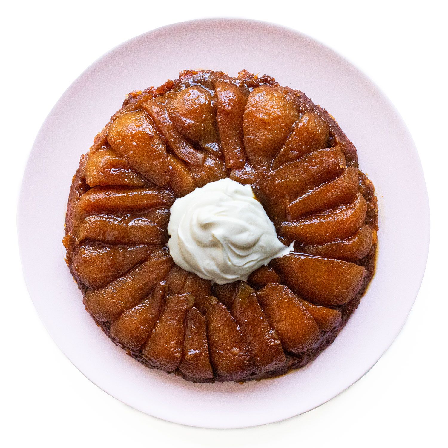 Coloca las peras formando círculos concéntricos alrededor de la sartén y aprieta bien unas con otras. Ayúdate de una cuchara para evitar quemarte.