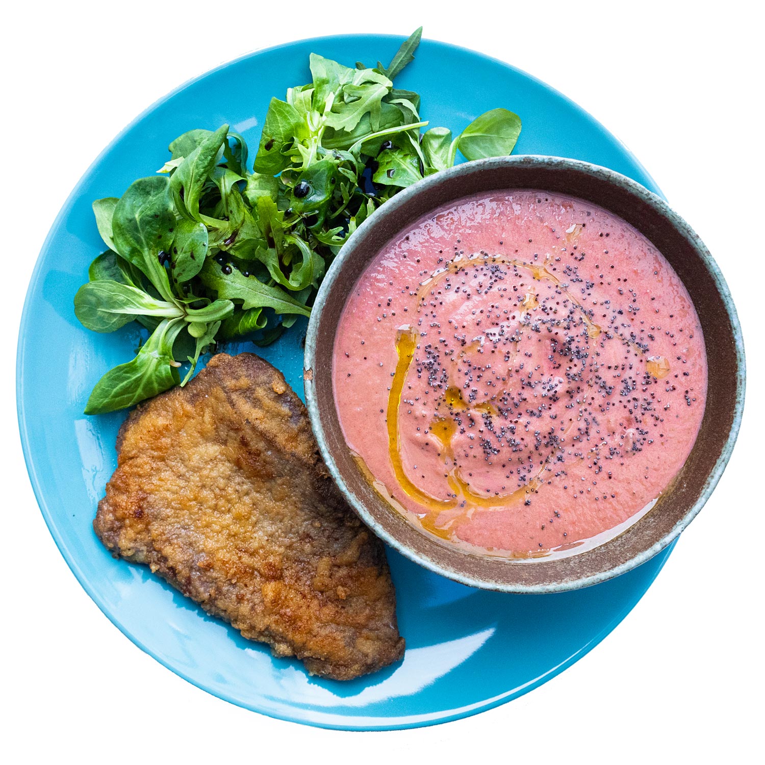 Sirve las milanesas con el gazpacho y decora con las semillas.