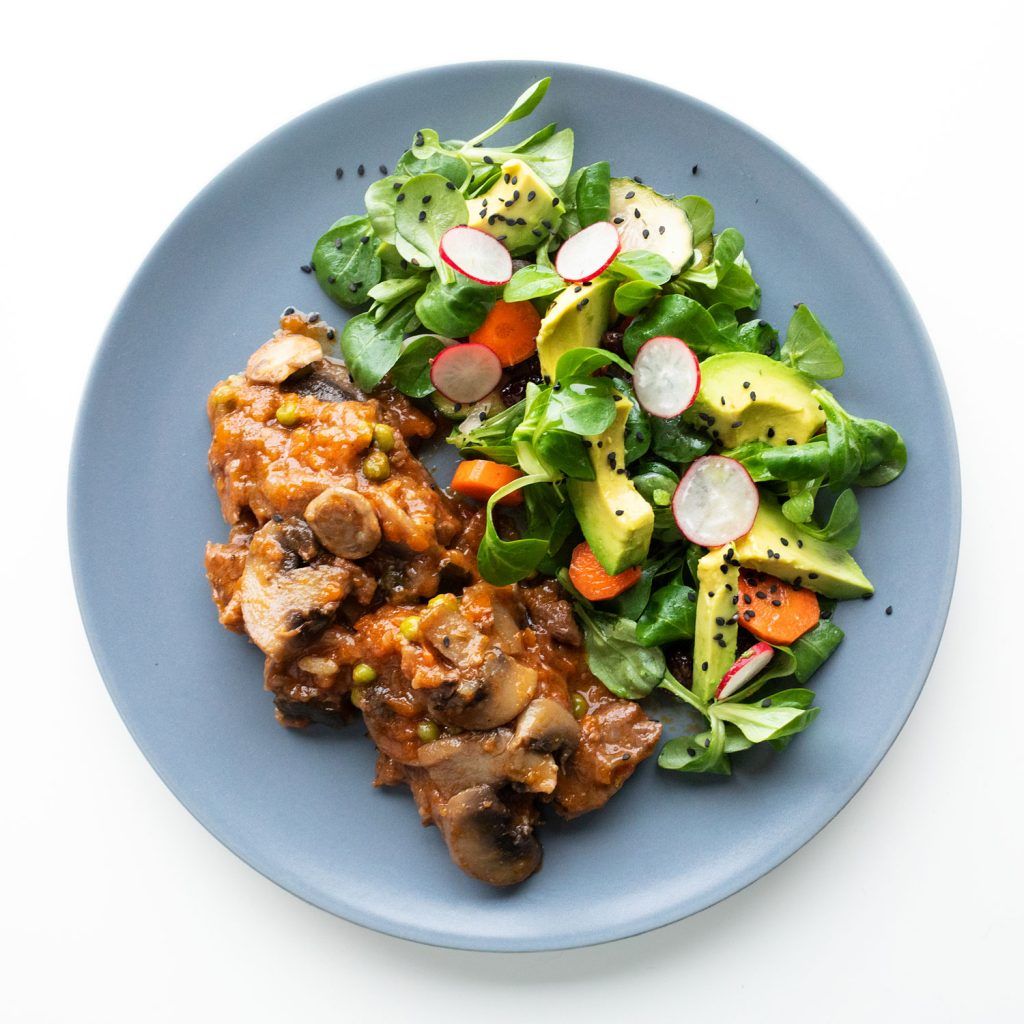 Ternera en Salsa con Champiñones y Ensalada de Encurtidos