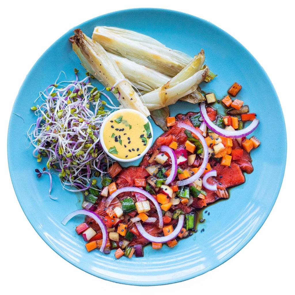 Sirve el tiradito con las endivias y acompaña con la salsa. Decora con las semillas + la menta + los brotes.