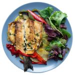 Retira la bandeja del horno y coloca el pescado sobre las verduras. Coloca el resto de ingredientes sobre el pescado y rocía con 2 Tbsp aceite de oliva.