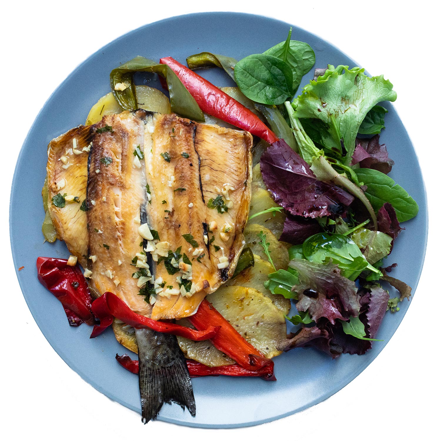 Sirve el pescado con patatas y acompaña con la ensalada.