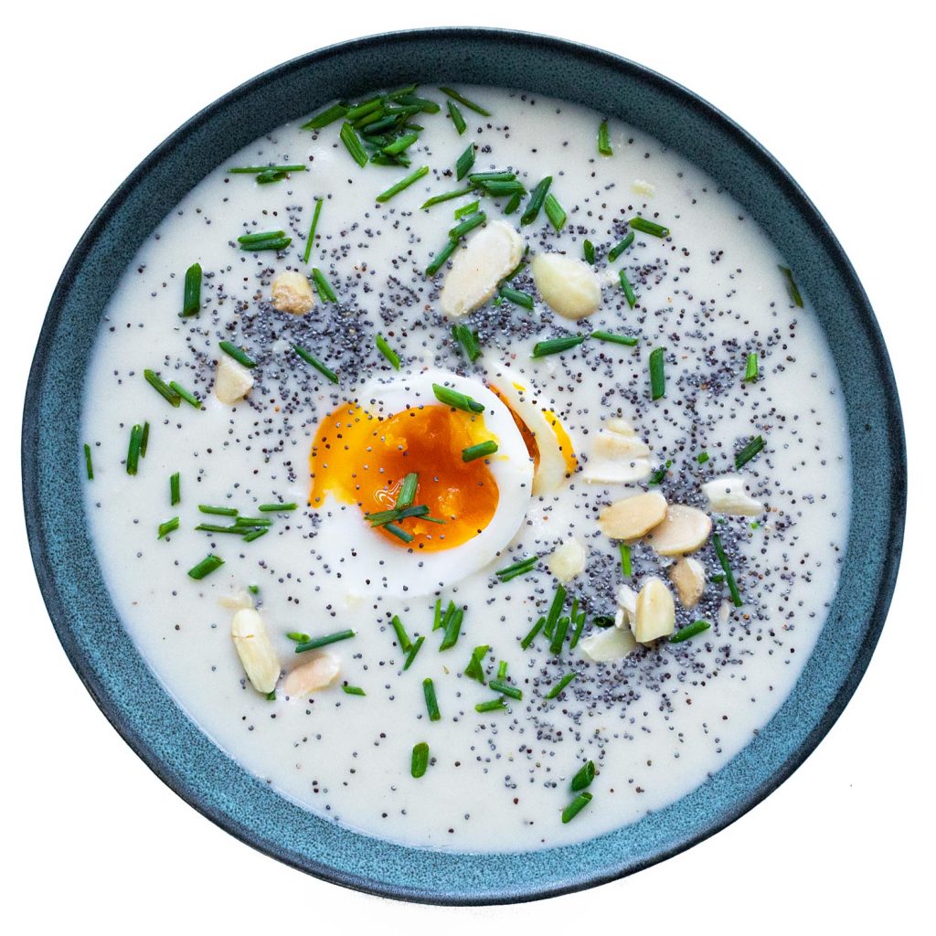 Sirve la crema en boles y coloca encima los huevos (sustituye por el jamón si haces AIP). Decora con las semillas + los frutos secos + el cebollino.