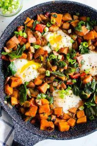 - Bate en un bol los huevos + el orégano + la albahaca + ¼ tsp sal. Añade la mezcla de la sartén y remueve.