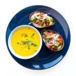 Sirve los aguacates rellenos acompañados del salmorejo.