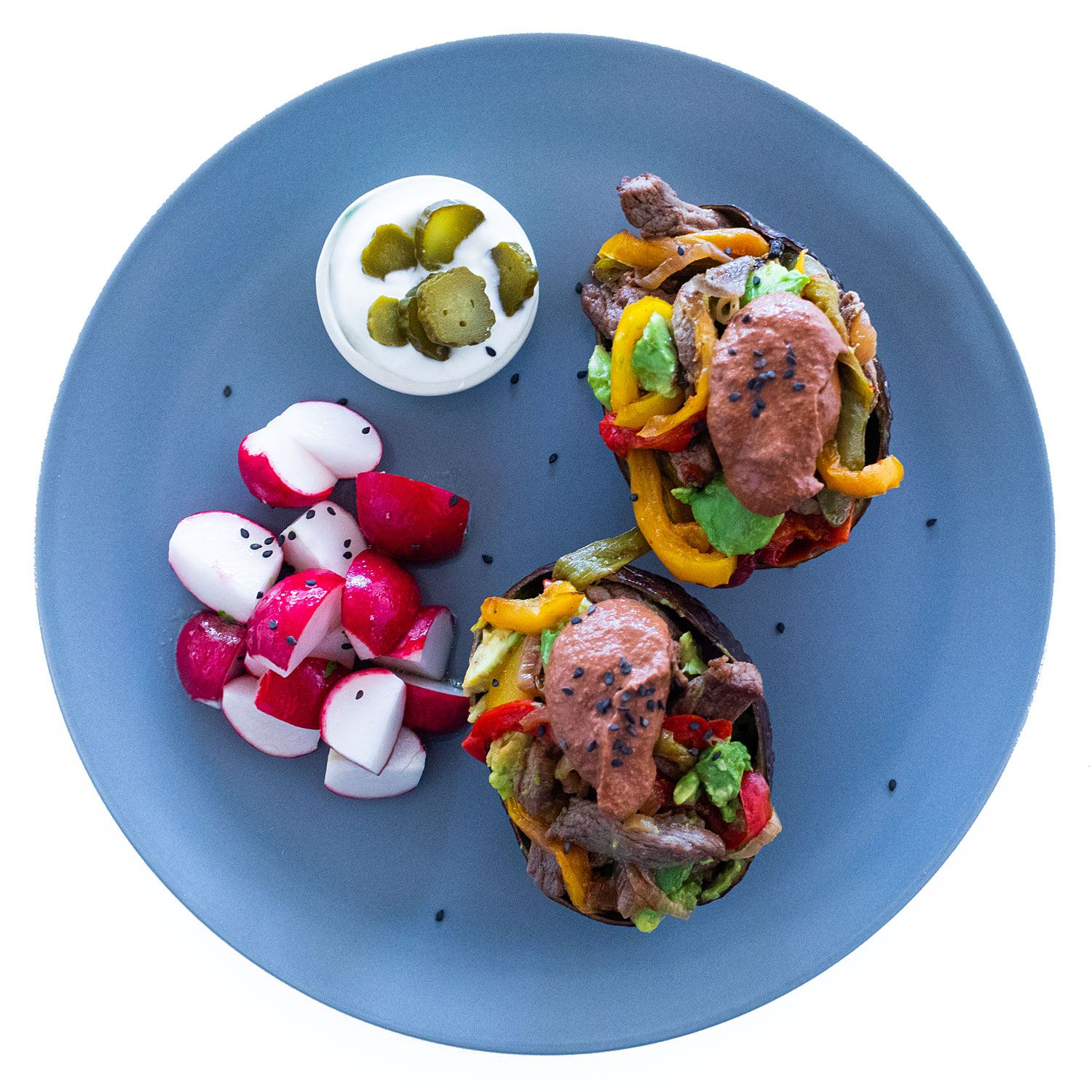 Vacía los aguacates y mezcla su carne con las verduras + la ternera + el mole. Rellena con la mezcla.