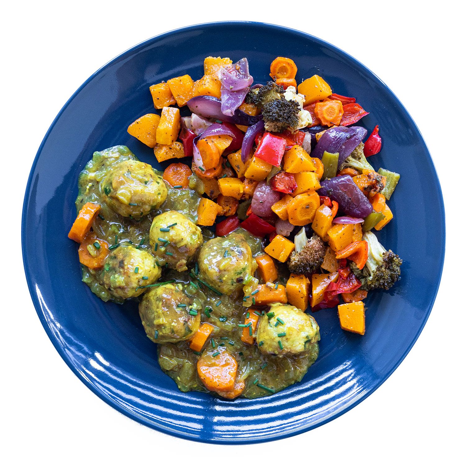 Sirve las albóndigas y decora con el cebollino. Acompaña con las verduras.