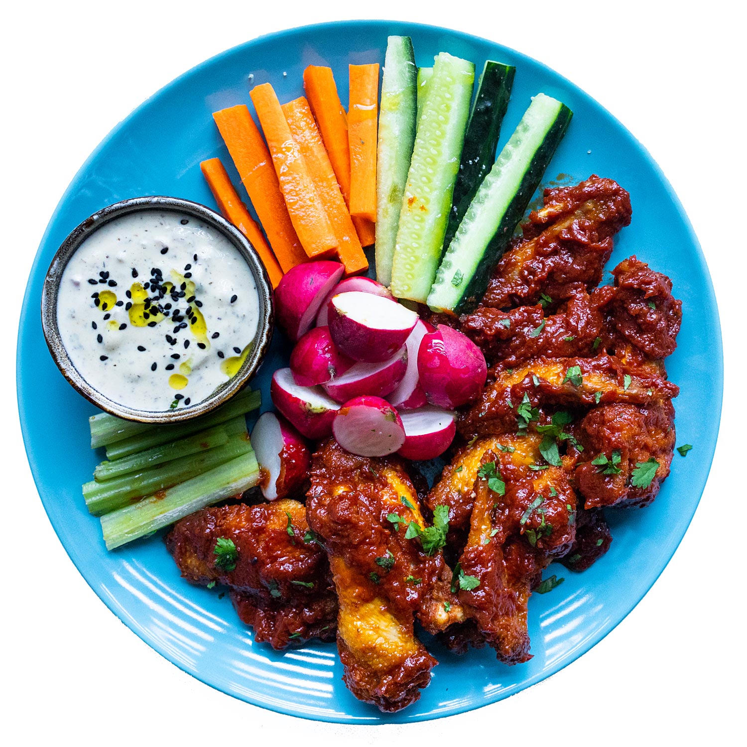 Sirve las alitas con la salsa y acompaña con los crudités.