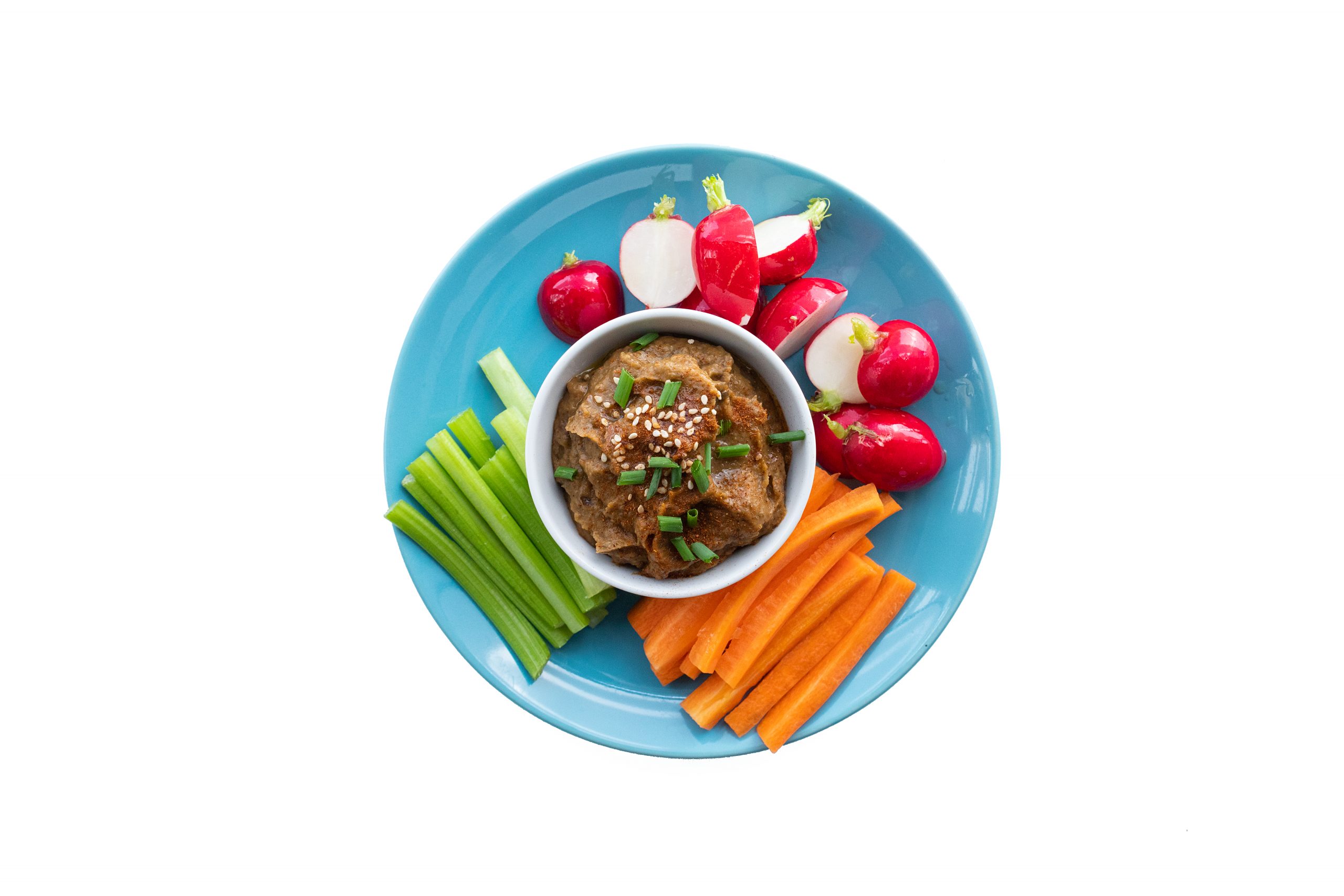 Decora el baba ganoush con el cebollino y sirve junto a los crudités.