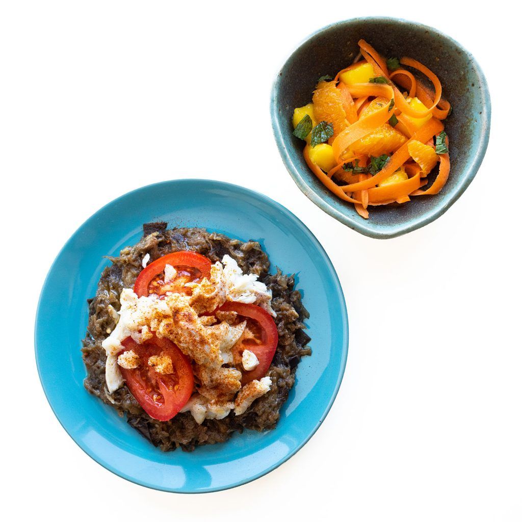 Coloca en la base del plato el zaluk + los tomates + 1⁄4 tsp sal + 1 Tbsp aceite de oliva y pon encima el bacalao desmigado. Acompaña con la ensalada.